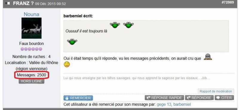 elle a gagne quoi Nouna 2500abeilles? :DTu dis ça parce qu’encore 35 posts et tu en gagnes 30 000… ça fait un bel essaim déjà.
