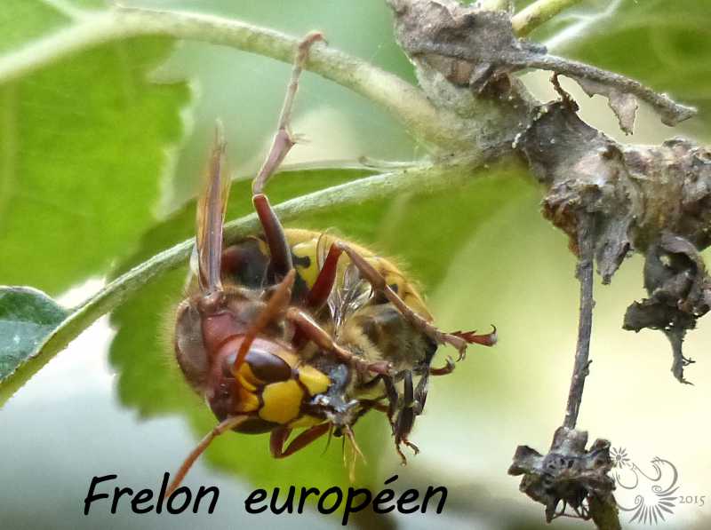 Les frelons européens que j’ai observés chez moi tentent parfois d’entrer dans les ruches, sans succès. Un nid s’est apparemment installé dans un trou de parpaing, sous un de mes essaims de cette année, on peut voir 1 ou 2 frelons passer dessous de temps en temps depuis mai et la cohabitation ne semble pas poser de problème. Par contre, j’en ai vu s’en donner à coeur joie au moment où j’ai donné l’extracteur à lécher près du rucher : des frelons profitaient de l’agglutinement des abeilles dans le miel pour les choper. En fait j’ai l’impression que la prédation du frelon européen est seulement opportuniste, contrairement au frelon asiatique qui est véritablement un prédateur.
