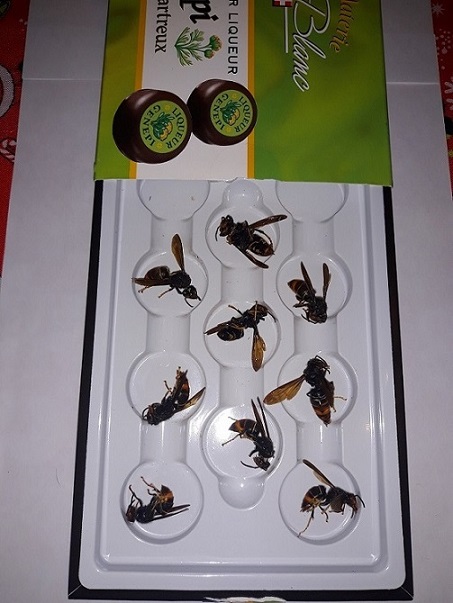 Moi, ma femme étant le linge dehors de ce beau temps, ce soir elle vient me voir et me dit regarde sur ton calbute en me le tendant: Il y a une grosse guêpe dessus en rigolant. Heu non c’est un frelon asiatique. Du coup elle me balance mon calbute tout propre par terre. Je l’ai écrasé. Il devait être coincé dans les fibres. Sinon dans mes pièges, il y en a pas mal. J’en ai loupé un hier soir qui tourné autour de mes ruches. Je pense que le mois d’août va être compliqué. L’année dernière on avait été tranquille mais les températures jouent en leur faveur.