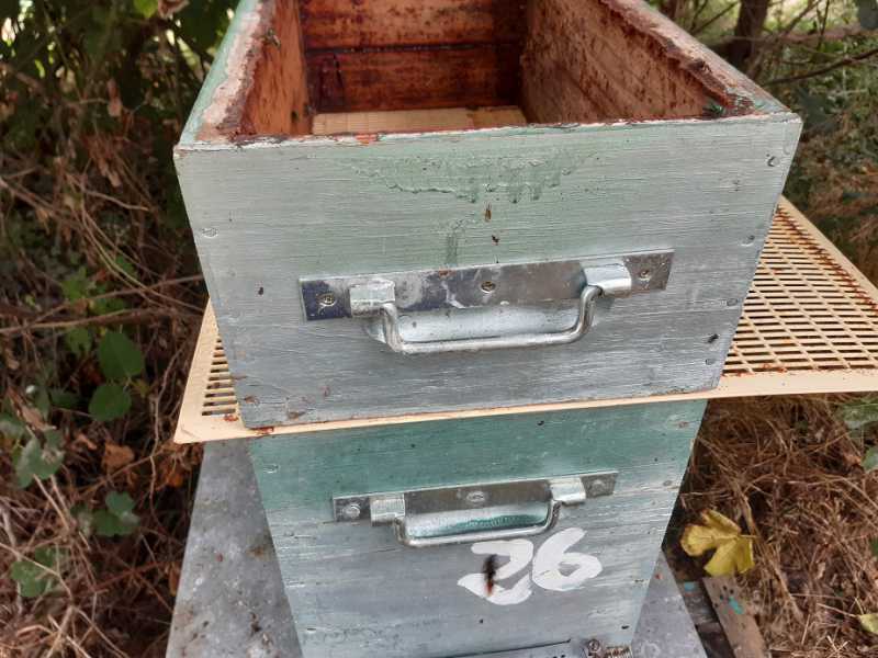 En fait, j’ai extrait le miel et mis les hausses au pillage. J’ai été surpris de voir des dizaines de frelons venir. Du coup, j’ai mis une ruchette vide avec le trou d’entrée bouché. Une grille à reine percée avec un goulot de bouteille attaché. Une haussette dessus pour tenir le tout. Un couvercle si la pluie menace. Au fond de la ruchette, des débris de vieille cire de cadre sur lequel je verse du miel de presse. Je l’ai mis à 10 h et il y a déjà beaucoup de prisonniers.(du moins, j’entends un grand bourdonnement sourd).Il y a trois ans, j’en avais capturé quatre mille, avec la grande impression que cela n’avait servi à rien ; d’autant que quand les feuilles des arbres de mon bois sont tombées, j’ai vu plusieurs nids.