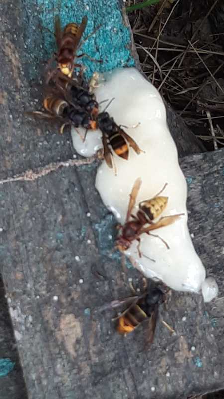 je suis toujours à l’affut devant les ruches, j’ai posé des pièges, 1 bouteille et une boite transparente avec 1/3 vin blanc, 1/3 bière brune, 1/3 grenadine;