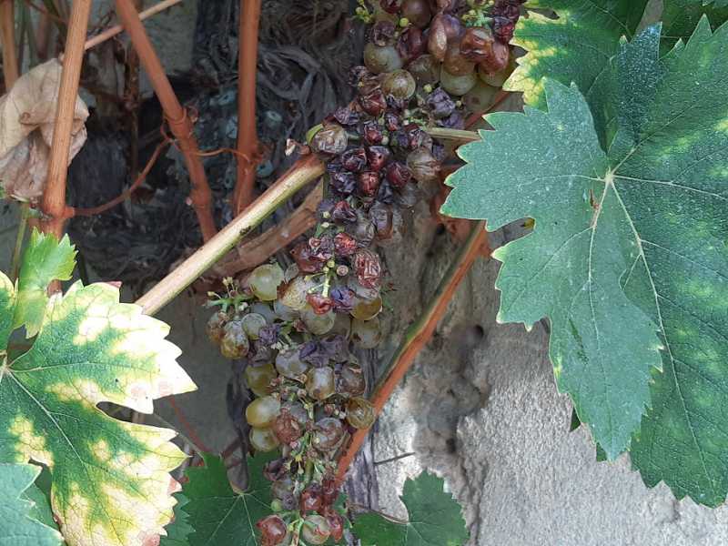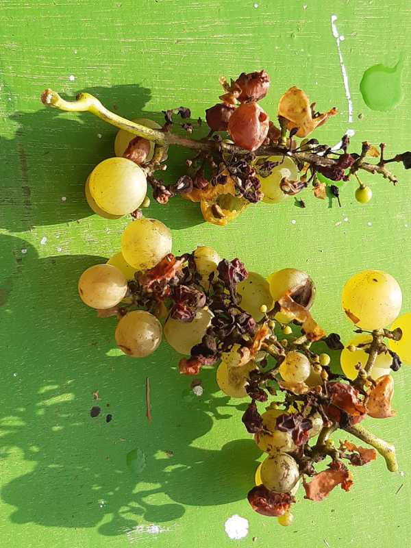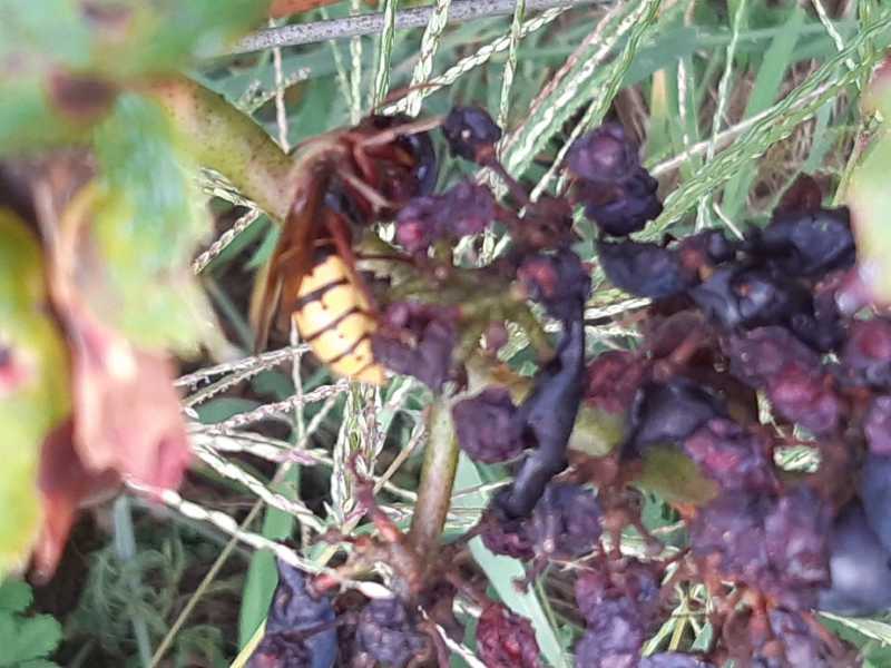 En ce qui me concerne, je dirai que non seulement ils cohabitent bien ensemble, mais qu’en plus leurs dégâts se cumulent. Je mets les photos de mon raisin de table : 300 souches en 45 variétés. Tout a été dévasté en 15 jours par les dégâts cumullés des deux espèces, sans compter les étourneaux. Ils ont toutefois le palais délicat car ils n’ont pas touché au “Noah”. Moi non plus d’ailleurs. Je préfère manger le raisin de la grande surface qui coûte bien moins cher que le mien et qui est meilleur. Quant aux abeilles, les deux en emportent, mais c’est l’asiatique qui fait le plus de dégâts.