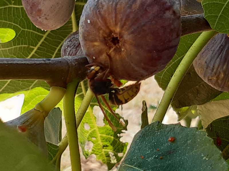 Et le voilà aussi, notre bon vieux frelon européen, comme l’appelle l’article du lien, en train de détruire mes figues et mes poires. Et quand tu attrapes lea figue ou la poire sans le voir, c’est la ou les piqûres assurées. Heureusement, la grande surface est là pour acheter mes fruits. Après,le côté positif de l’article du lien, c’est que les Allemands veulent déménager les nids pour les emporter chez eux. Donc,ils peuvent venir prendre les miens !. Mais j’ai un gros doute.