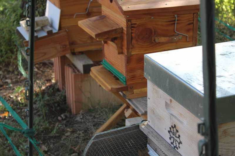 Il y a des frelons un peu partout avec des pressions inégales selon les emplacements, une portière verte va être vissée sur chaque entrée pour freiner les bestiaux et faciliter l’organisation de la défense par les abeilles elles mêmes.