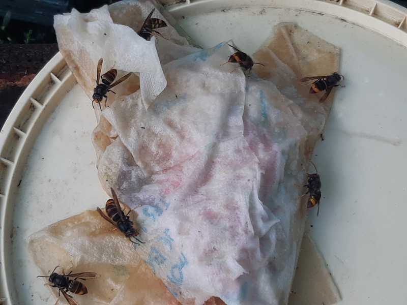 Un peu d’écume de miel sur un papier essuie-tout oublié sur un couvercle et dès sept heures du matin. Ils sont là, fidèles au rendez-vous, comme chaque année. Et comme chaque année, je pose mon piège. Et deux heures après, une trentaine de prisonniers ; sans doute quatre mille dans un mois, avec mes deux pièges, comme tous les ans. Et après ! j’ai bien conscience que cela n’aura servi à rien quand, en automne, les feuilles des arbres étant tombées, je découvrirais une dizaine de nids, comme chaque année !