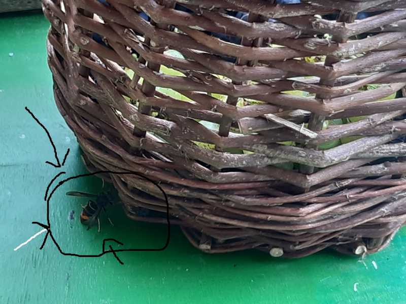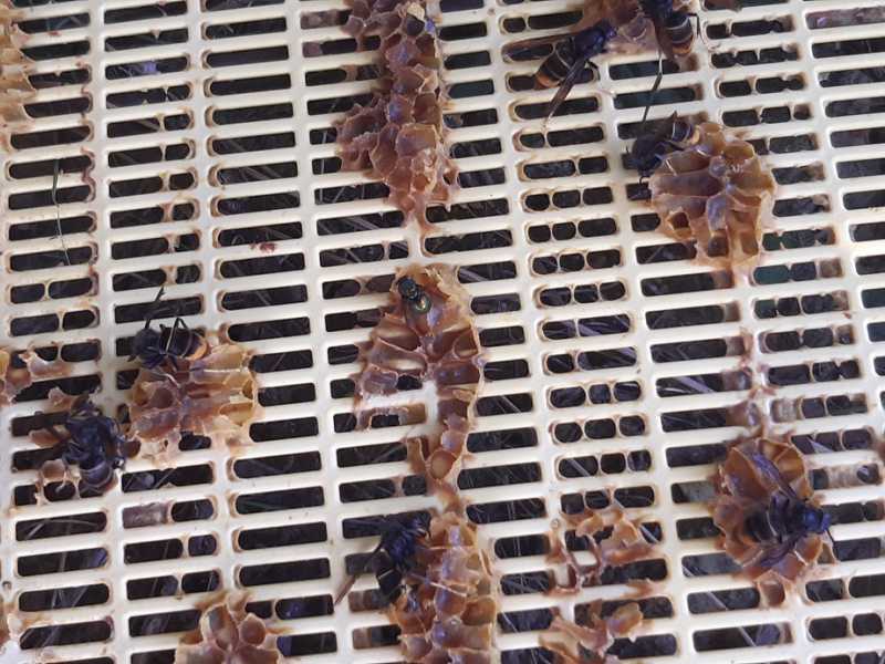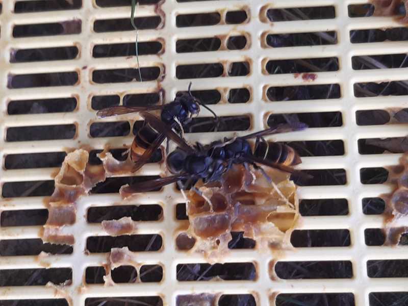Une grille à reine posée sur le sol et, dans les dix minutres, une vingtaine de frelons. Quand je récolte et enlève le couvre-cadre, presque de suite, un d’entre eux se pose sur la hausse et y rentre. J’en ai eu plusieurs qui sont rentrés dans la pièce où j’extrais le miel, après être rentrés dans la hausse.