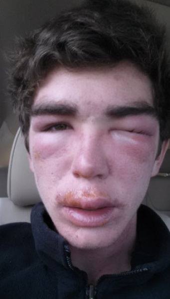 Dans la nuit l’œil droit complètement fermé et violacé.