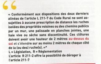 Vous pourrez y lire que pour que le coup de haie de 2m s’applique, il faut quand même que les ruches soient à plus de 20m des habitations ou des voies publique, ce qui est quasiment la limite minimale à respecter sans la fameuse haie!