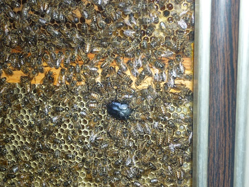 – et à l’intérieur de la ruche je me retrouvais avec encore plus de cétoines, cette fois coincés à l’intérieur de la ruche du fait du portillon.