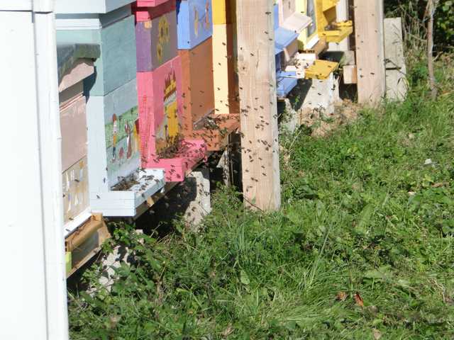 ) et un autre que j’ai emmené au rucher école. Ce dernier m’a donné de belles abeilles bien noires… L’autre, (qu’on avait fait avec Franz) qui est resté sur place a des abeilles avec qq anneaux jaunes ; pour ce dernier on avait pourtant pris soin de sélectionner un cadre avec jeune couvain issu d’une ruche de noires… Mais j’ai un voisin à 1 km qui achète de la buck…