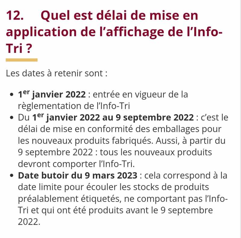– 9 mars 2023 : Fin du délai accordé pour l’écoulement des stocks de tous les emballages fabriqués avant le 9 septembre 2022.”Donc pour tout ce qui est mis en pour avant le 9 septembre tu peux vendre jusqu’au 9 mars 2023.