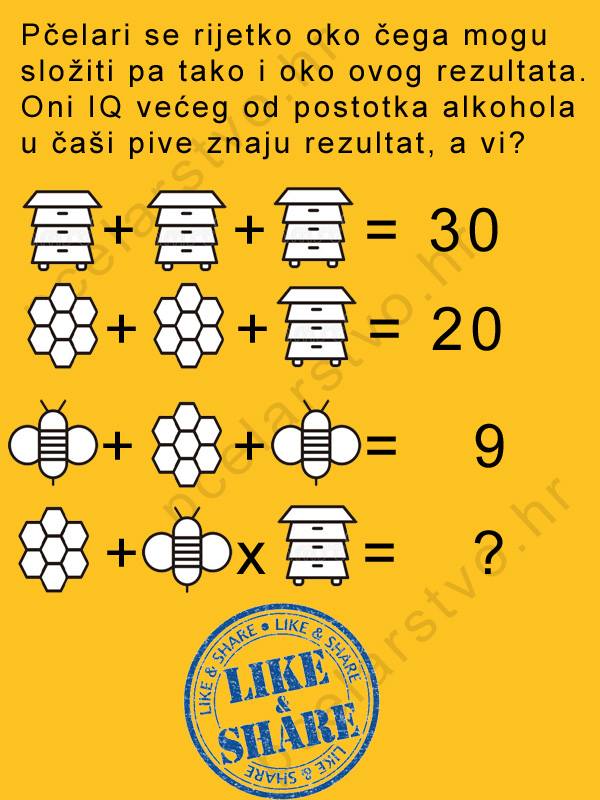 Plutôt 25. Sans vouloir offenser personne, la traduction est intéressante: “les apiculteurs peuvent rarement se mettre d’accord sur une chose tout comme sur le résultat de cette équation. Ceux avec un QI supérieur au pourcentage d’alcool d’un verre de bière connaissent le résultat, et vous?”