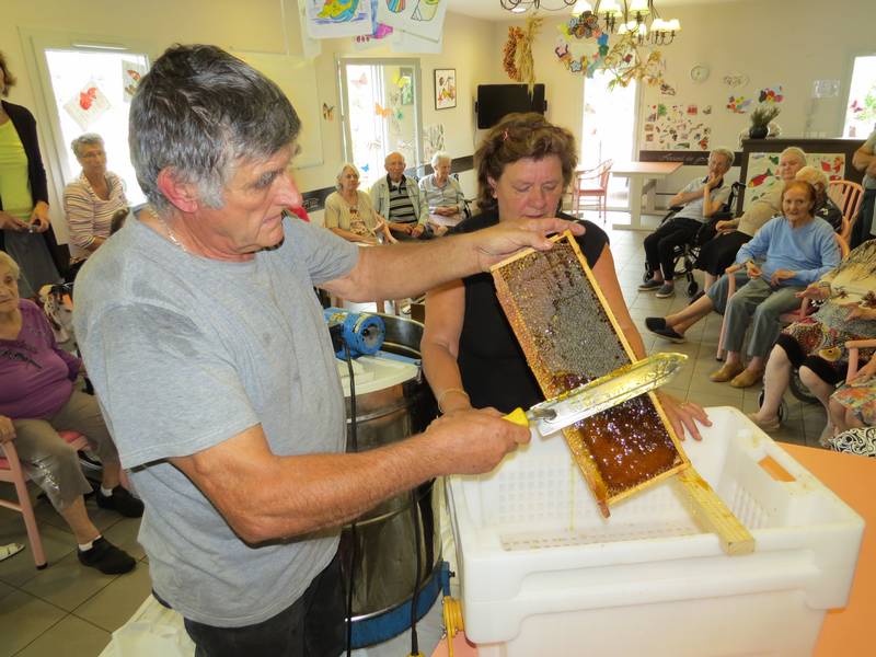 C’est deux apiculteurs qui désoperculent ensemble dans la miellerie.