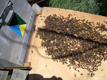 Tu as expliqué à peu près la même chose ! Tu met une caisse vide à l’emplacement d’origine et tu secoue les cadres à 10 mètres. Sauf que moi je secoue les cadres juste devant avec une grille à reine à l’entrée ! C’est kif-kif !Là, c’est cool, comme pour l’enruchage d’un essaim naturel, les zazas, prennent le chemin de la ruche, en procession, et tout va bien !