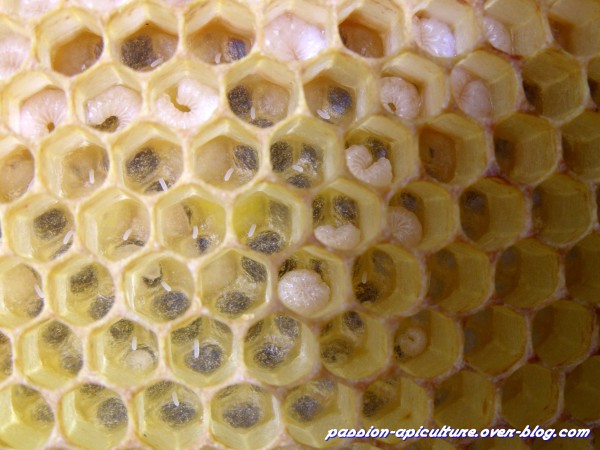 Bon. Reste à espérer qu’il y a aussi des oeufs dans les 3 cadres de couvain. C’est possible, j’ai beau avoir de bon yeux, je n’arrive pas à les voir avec le grillage de la tenue + le soleil + les abeilles sur les cadres… Manque de pratique tout ça !!!J’ai trouvé sur le net une photo qui correspond à peu près au stade des mes larves