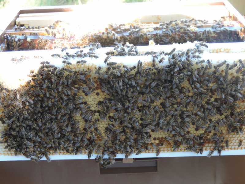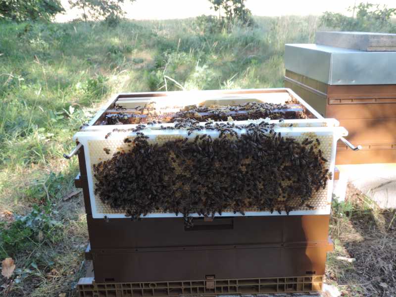 @+Pour le moment, je suis à une toute petite échelle, donc difficile de tirer des généralités. Alors sur cette première ruche, la photo a été prise le 25/06, baticadres placé le 15/06. Le 20/08, j’ai transférer une partie des baticadres vers une colonie plus petite (passé 5c à 7c). En moins de trois mois de présence, il n’y avait pas de pont entre les étages. Pour cet hiver, j’ai donc deux colonies qui hivernent avec respectivement 6 (#3c de corps)et 4 baticadres (#2c). Je te dirais en mars, puisque je compte prendre ces cadres pour amorcer mes naisseurs (haussette 6c, qui seront sur 3 baticadres au début). En 2015, je n’ai pas compté les varroa, ca fait partie des choses que je vais mettre en place pour 2016 (c’est ma première année pour rappel). L’an prochain je vais en utiliser beaucoup plus…