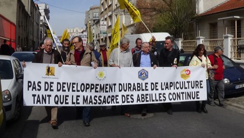 17.02.2015 . Le 1er avril 2014, manifestation devant le siège de FranceAgriMer, dans la banlieue de Paris, pour réclamer l’interdiction des pesticides tueurs d’abeilles.