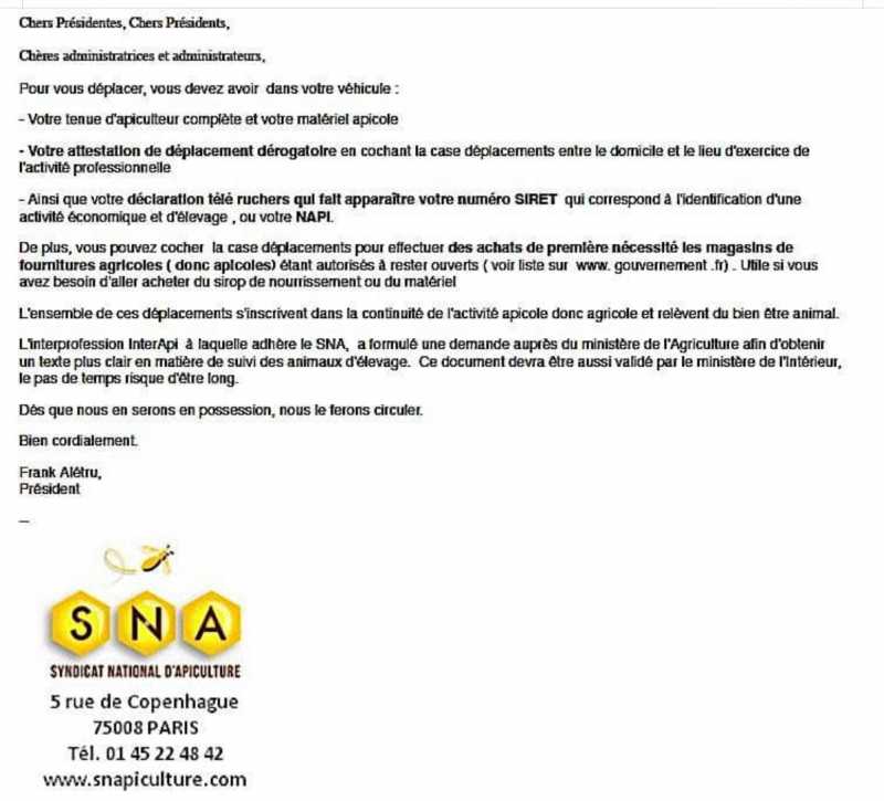 Je vous joins ci-dessous la lettre reçue du Syndicat National d’Apiculture.