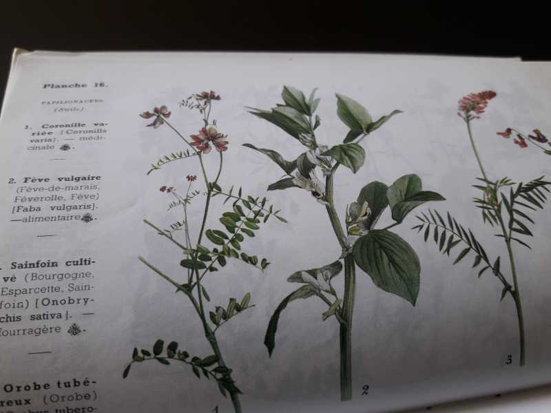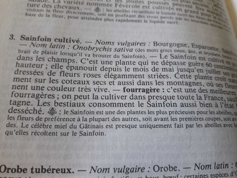 Moi , étant un vieux , je n’ ai que de vieux livres . Celui ci a été écrit en 1920 . Je m en sers pour reconnaitre les plantes même si je n ai pas toujours la réponse . L’ auteur a dessiné une petite abeille sur les plantes melliferes . J ai mis la couverture du livre et la page du sainfoin . Après , ce n est pas parce qu une plante est mellifere qu on est sûr d avoir du miel . Il faut aussi que les conditions climatiques soient favorables . Par exemple , le tournesol chez moi cette année n’ a rien produit malgré une belle floraison après le 20 aout