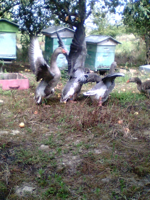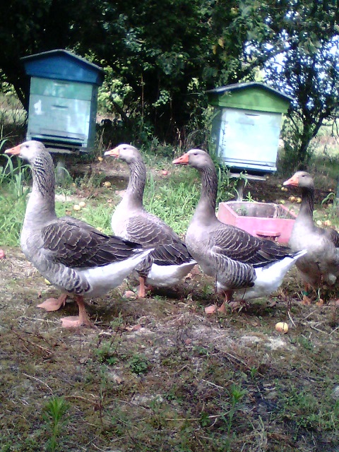 Je devrai faire venir la presse et dire que le frelon asiatique a un nouveau prédateur, en plus du poulet !!! : L’oie de Toulouse qui patrouille et qui bat des ailes pour les faire fuir !!.