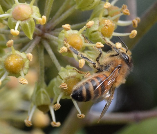c’est le début , beaucoup de fleurs sur le lierre bien exposé et le reste prendra le relai dans les semaines à venir , il était temps !!! c’était un peu la disette et je commençais à entrevoir des stocks de sucre pour le sirop . 9 abeilles sur 10 se présentent sur la planche d’envol avec des belles pelotes, et l’activité est impressionnante