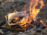 Ce matin, brûlage de tous les cadres, couvre-cadre et nourrisseur, et enfouissement des cendres. désinfection à la javel des abords de la ruche.
