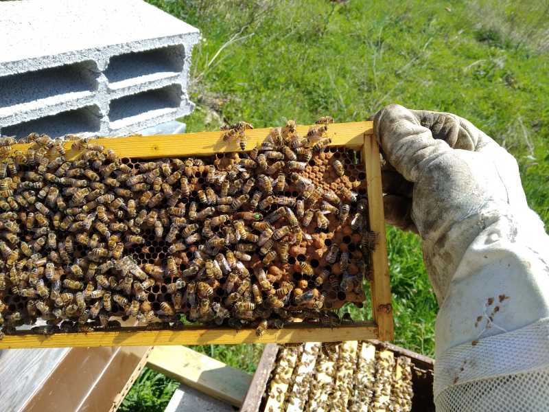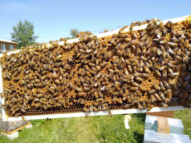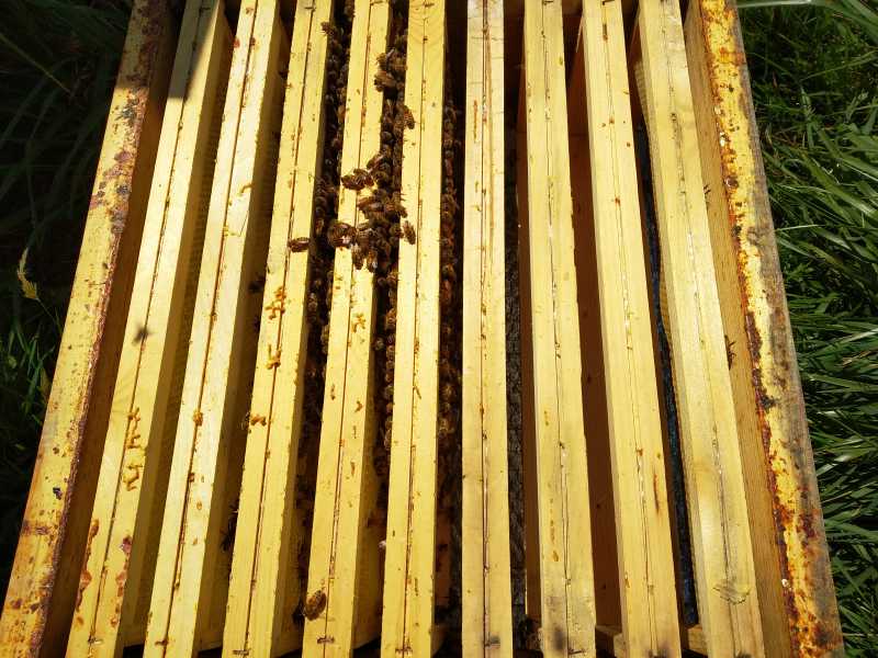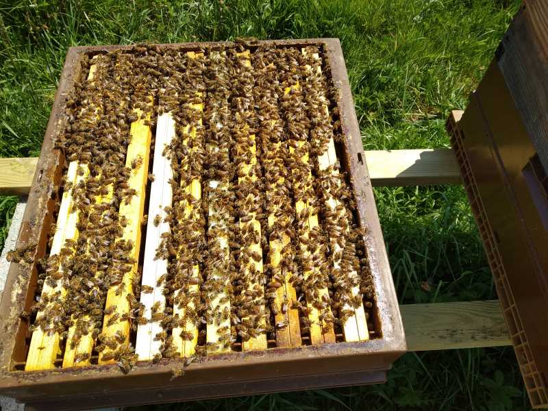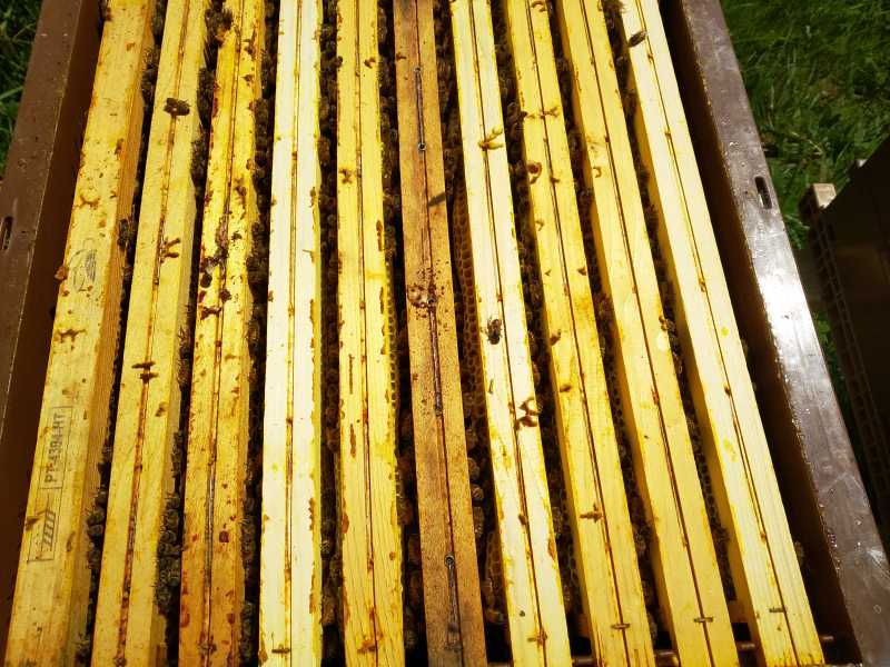 Sur celles qui avaient hivernées sur 5-8cc, pas de cr, 1/3 avec amusettes pondues. J’ai viré un cadre de couvain. Toutes ont leur première hausse remplie (celles dédiées à leur reserves) et elles attaquent la première hausse pour moi