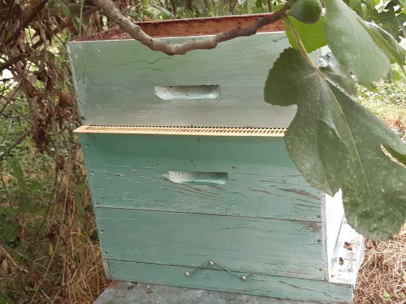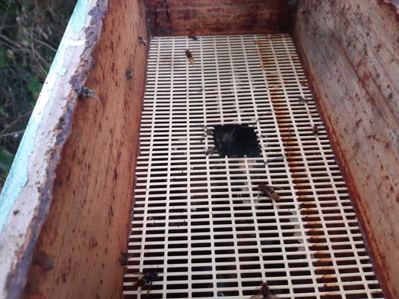 La ruchette piège est située à cinquante mètres du rucher, à côté des hausses que les abeilles nettoient. J’entends un bourdonnement à l’intérieur, mais évidemment, pas question de regarder. Je vois juste leurs pattes qui traversent la grille.