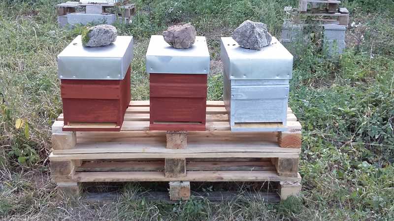 effectivement sur les 3 ruchettes seule l’une a la planche d’envol de peinte (celle du milieu), pour les 2 autres j’ai simplement forcé sur l’huile de lin. Je me dis que c’est pas terrible de mettre de la peinture sur la planche de vol sachant qu’elles sont souvent en train de faire briquer le pont