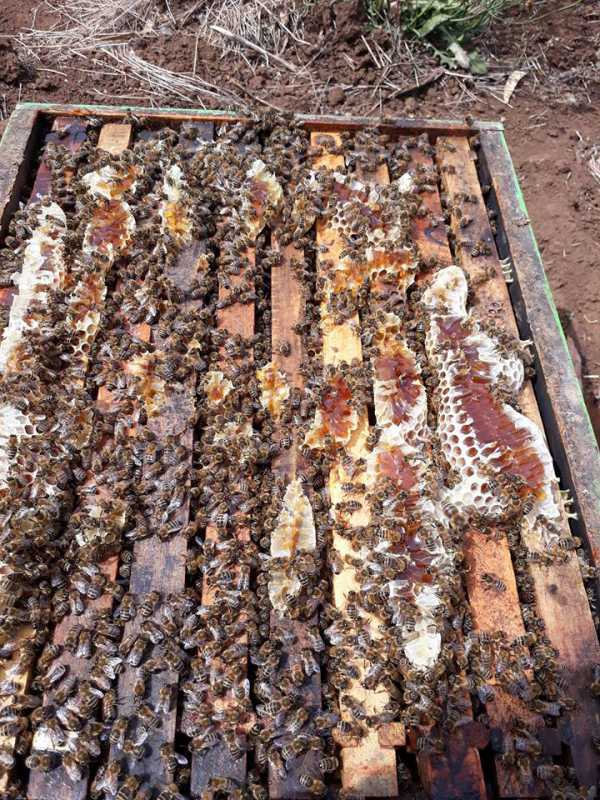 J’en avais nourri 5 au sirop à l’automne, 3 me paraissaient assez garnies et je n’avais rien mis… c’est parmi ces 3 qu’une est morte, de faim. Tous les cadres sont vides, certains avec abeilles le nez dans l’alvéole. Le restant de la colonie en tas au fond de la ruche…