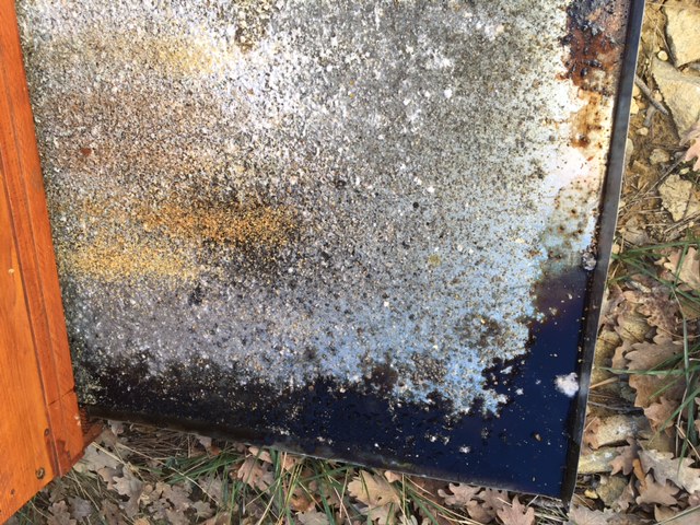 Petite visite sur mon rucher aujourdhui … Voici le résultat : trois ruches en vrac avec moisissure et une sorte de jus noir…..