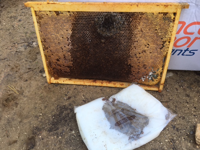 il restait un cadre avec moitier de miel et un petit rond de pollen que les pilleuses étaient en train de prendre