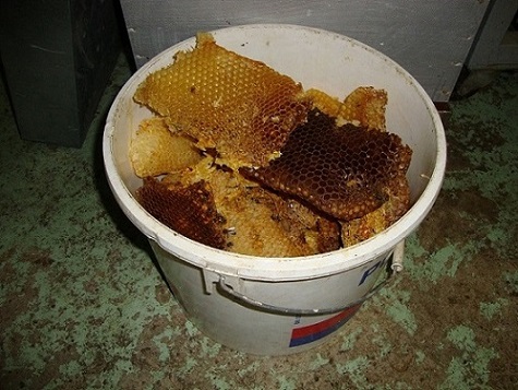 C’est le seau de cire récupéré dans le foot chamber. A la récolte, ou un peu plus tard, c’est vide et sec, les abeilles l’on déserté, et ça fait une belle récolte de cire ! Non ? Pourtant vos commentaires sont les bienvenus !