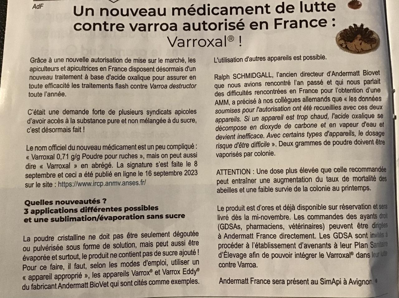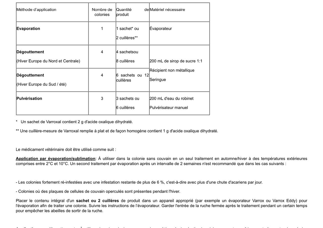 Bonjour Willy je viens de parcourir la fiche technique du produit varroxal , il n’y a aucune précision pour le bio , par contre la composition est de l’acide oxalique dihydatré pur et rien d’autre . Pour moi oui utilisable en bio car sinon quoi d’autres , donc trouver qui peut nous renseignez . Il existe plusieurs contenant suivant le nombre de ruches à traiter , utilisable en sublimation ou en égouttement .