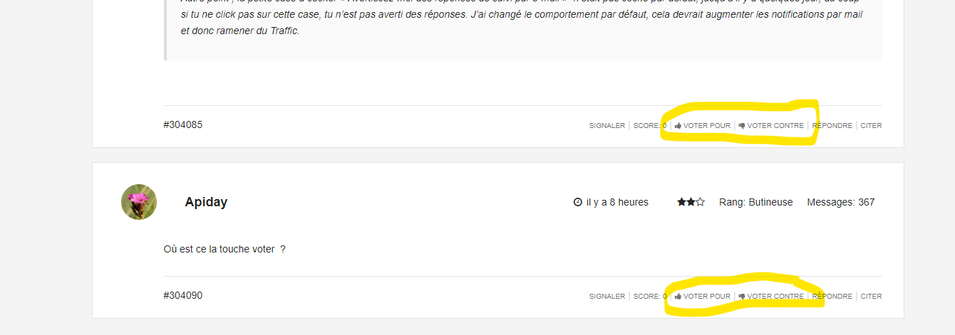 Autre point , la petite case à cocher “Avertissez-moi des réponses de suivi par e-mail” n’était pas coché par défaut, jusqu’à il y a quelques jour, du coup si tu ne click pas sur cette case, tu n’est pas averti des réponses. J’ai changé le comportement par défaut, cela devrait augmenter les notifications par mail et donc ramener du Traffic.
