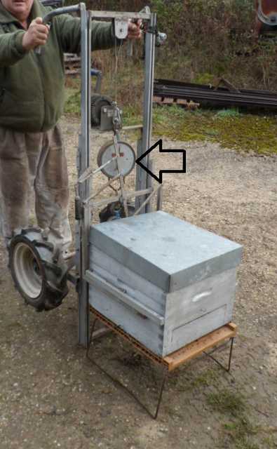 J’estime le poids des ruches en les soulevant par un coté (car j’ai du porte-à faux) devant et derrière avec mes support.