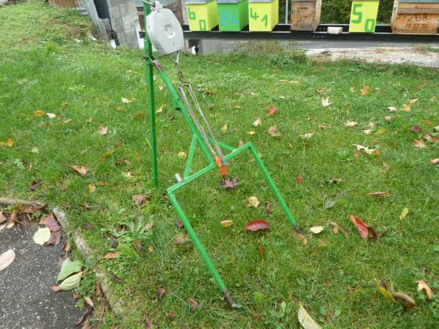 Voir sur les photos, j’ai installé le peson sur un étais de plaquiste, ou troisième main, du coup le réglage en hauteur se fait sur un cliquet, il suffit de mettre un pied sur la semelle au sol, de tirer vers le haut pour décoller l’arrière de la ruche, puis de basculer très légèrement l’ensemble vers l’arrière.