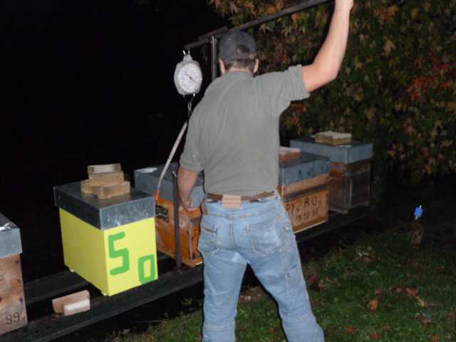 Je veux bien te donner mes chiffres, mais tout dépends de la tare initiale, une ruche vide c’est 16kg, le maxi atteins cette année 50kg. Mais c’est une erreur, car la reine n’a plus de place pour pondre, j’ai du retirer un cadre de rive et le remplacer par un cadre extrait en bordure de couvain. Sinon à 36kg je donne 3kg de sirop (c’est mi-automne!) puis début décembre c’est au candi.