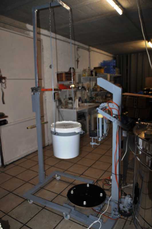 Lors de la monté du seau(40 kg) une chaine fixée à la potence et au cerclage du bas, bascule le seau dans un petit maturateur