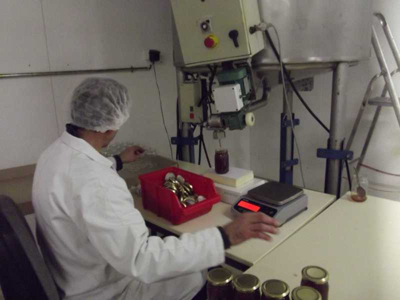 En suivant, un 2 ème opérateur, pose les étiquettes, met en cartons et les place sur palette.Remarquez, ici l’embout en sortie de pompe pour miel liquide (ici châtaignier).