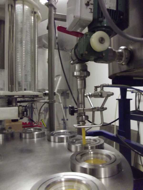 L’embout de sortie vissé sur la pompe, pour miel crémeux est de la forme entonnoir, il se termine par le système souple coupe gouttes (les 2 tiges rondes en forme de pince et commandées par sytème air comprimé, ferme hermétiquement le temps de changer de pot et surtout sans apporter de surpoids dans le pot). Remarquez la propreté du plateau.