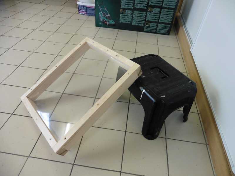 J’ai d’abord fabriqué un cadre avec un tasseau de 50×30, et fixé la feuille de plexy avec un autre de 10×30.