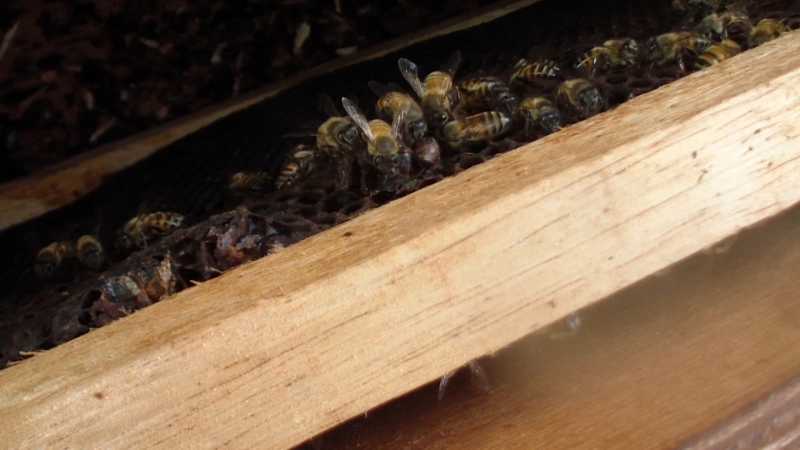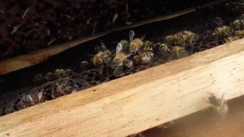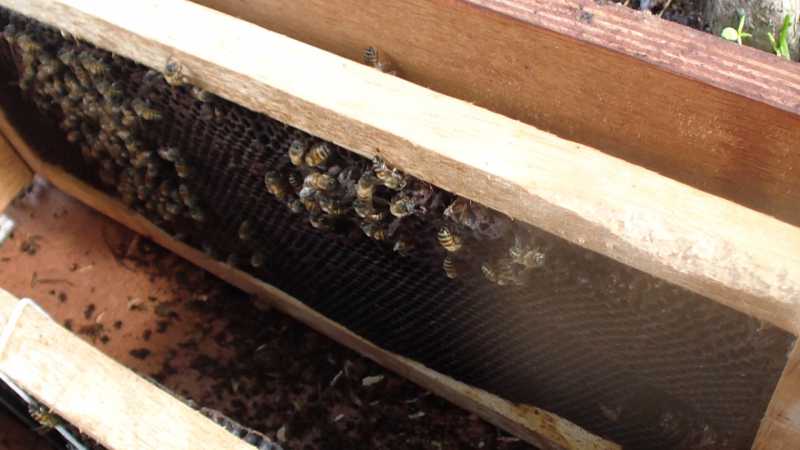 Les trucs par terre sont des morceaux d’alvéoles, il y a eu du pillage, + un rongeur qui est entrée et a mangé dans le couvain. Mais on avait bien nettoyé je ne sais pas pourquoi elles refond des déchets comme ça.