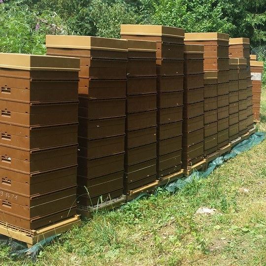 Pour moi cette année une seule hausse par ruche, mais bon c’étas ma première annéé, j’ai attaqué avec des hausses neuves juste ciré ,les zazas ne montais pas dans les hausses ont blindée le corp de miel puis essaimé. Et comme ca donnais pas ,j’ai fais un EA sur chaque colo alors je peu pas dire quel était en pleine production.