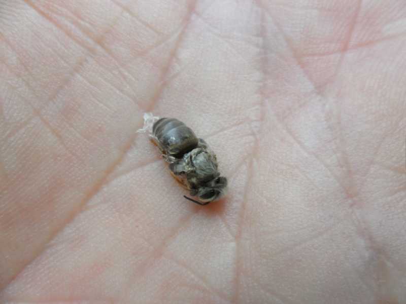 Nymphe probablement atteinte du virus des ailes atrophiées, évacuée de la ruche avant sa naissance.