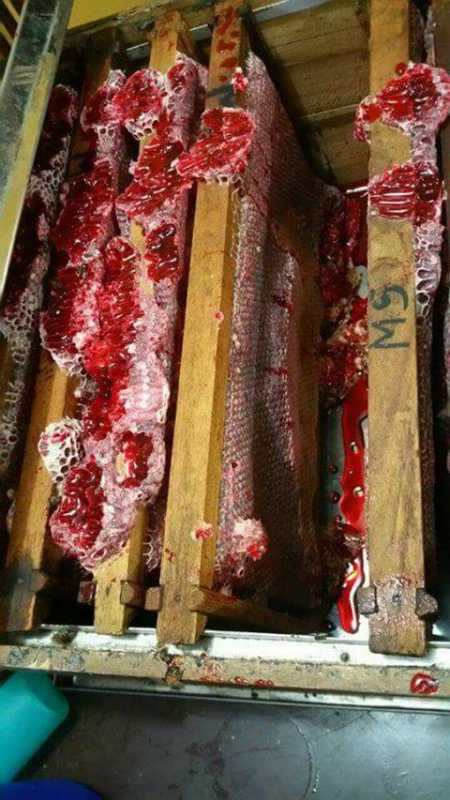 je viens de récolter un miel il y’a 15 jours,miel que je pensais toutes fleurs mais qui est vraiment atypique et corsé.pour rappel,je suis en plaine et pendant la miellée,il y’avait en fleurs: ronces,quelques tilleuls,trefle et fleurs des champs puis assez loin,du sarrazin,un champ de carottes et un d’oignon.une chose qui m’a “choqué”avant la récolte est l’odeur qui se dégageait des ruches,odeur amplifiée quand j’ai enlevé les couvre cadres des hausses.une odeur pas tres agreable me rappelant la patée pour chiens