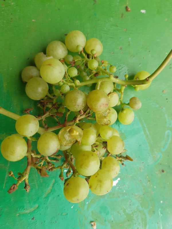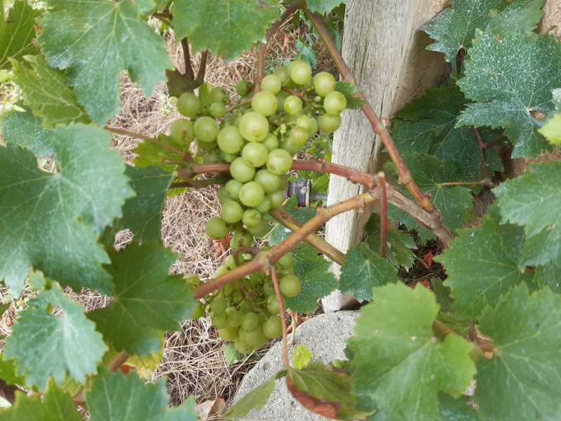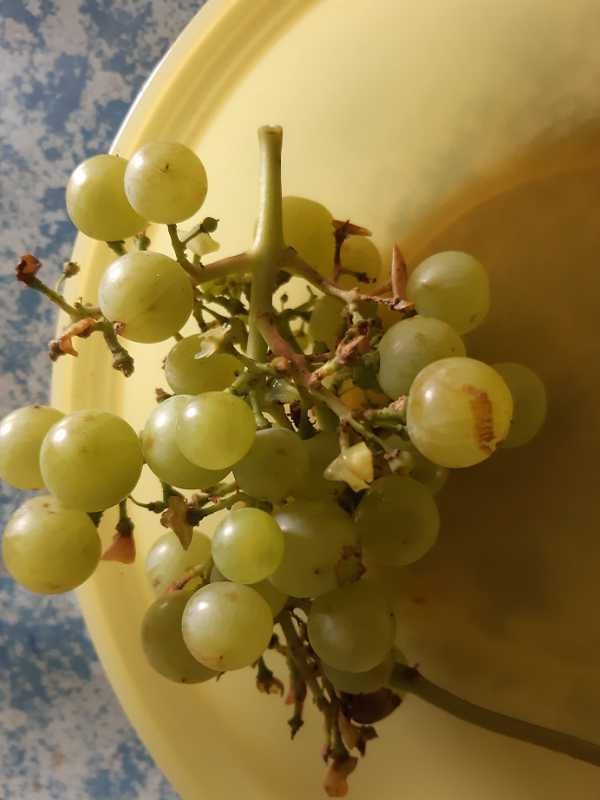 La première grappe de raisin, ou plutôt le grapillon qui reste après le passege des voleurs à deux ailes. Il s’agit de la variété Perle de Scaba, la variété la plus précoce que je possède ; un peu en retard cette année. Le rendement est de toute façon très faible.
