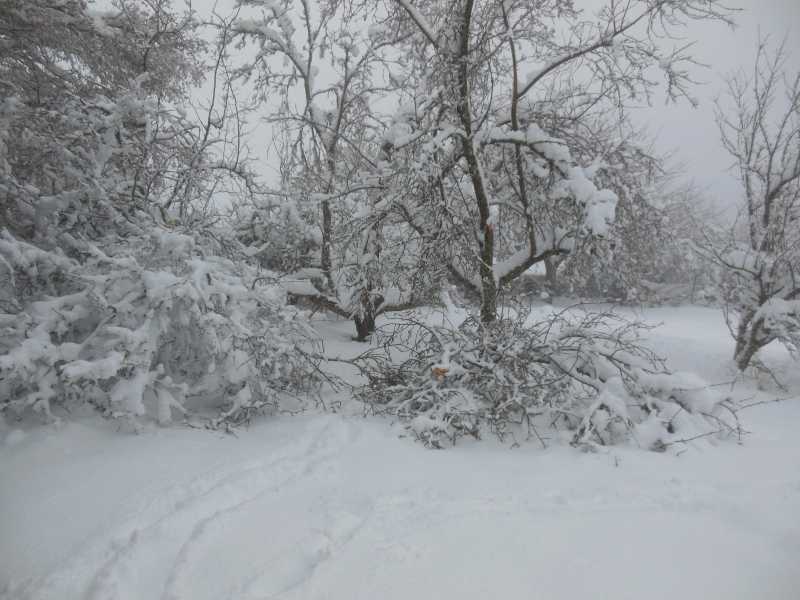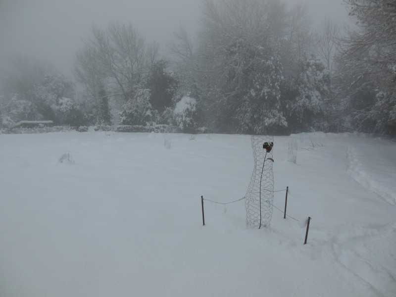 Bon aujourd’hui ils sont sous la neige, il m’a fallut relever le grillage de protectionVerger sous la neige :