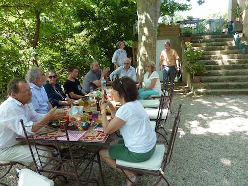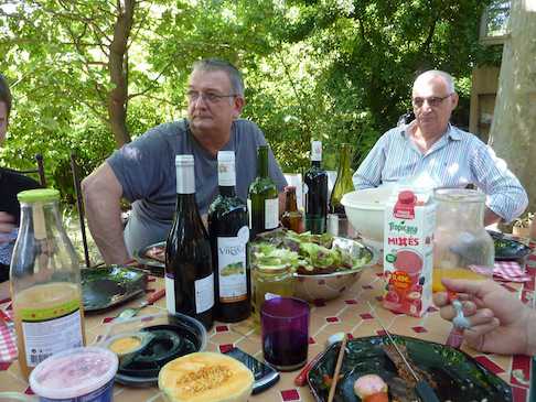 Gege arrive avec des caisses de vin, nouna avec ses supers salades,patrice ses saucissons et ses ruchettes et du miel pour tout le monde frans avait fait le fameux gateau mais il y avait trop de tartes mais il avait aussi des fromages geants excelents miam miamet je savais que ‘ca prendrais ‘avec mes autres connaissances apicoles