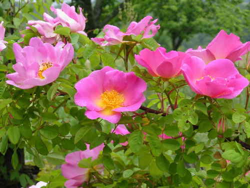 Seules les roses simples sont mellifères : églantier (rosa canina) ; j’ai vu pas mal d’abeilles sur le rosier complicata, un peu l’an passé sur les rosiers rugosa… L’avantage supplémentaire de ces rosiers (et églantiers) c’est qu’en hiver tu peux récolter leurs cynorrhondons pour faire de super confitures…